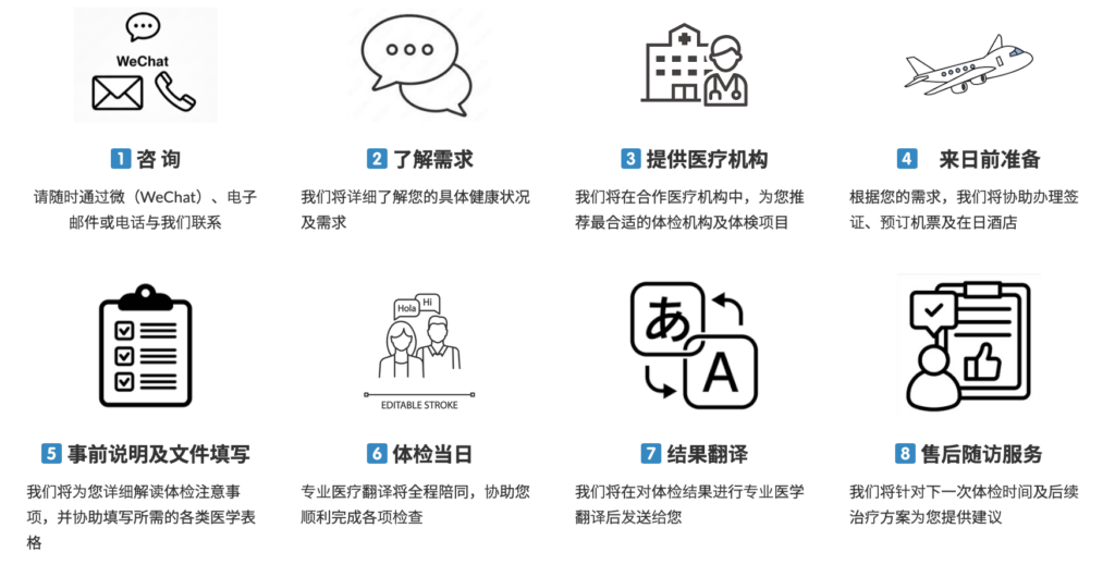 我们提供从预约、当日陪同翻译到体检结果翻译的全方位支持。